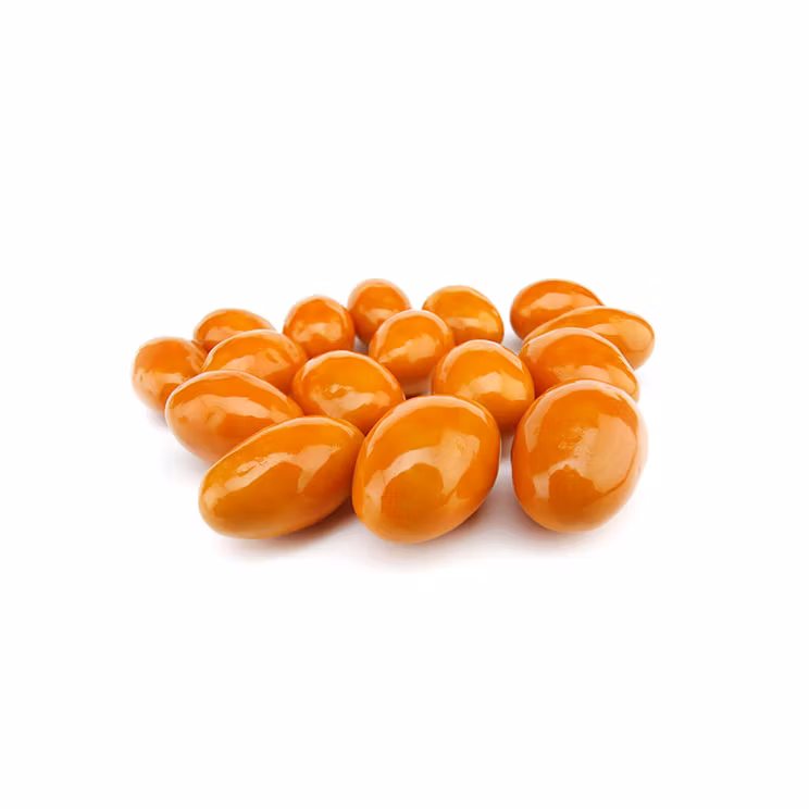 Beskrivning: Mandlar dragerade med mjölkchoklad, vit choklad och apelsin.